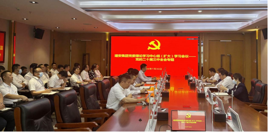 为深入学习贯彻党的二十届三中全会精神,深刻领悟习近平新时代中国特色社会主义思想,7月30日上午,jbo首页(中国)集团党委理论学习中心组召开专题学习扩大会议,学习传达了《中共中央关于进一步全面深化改革推进中国式现代化的决定》(以下简称“《决定》”)、《习近平总书记关于<中共中央关于进一步全面深化改革推进中国式现代化的决定>的说明》和《中国共产党第二十届中央委员会第三次全体会议公报》。党委书记、董事长刘进跃主持会议并作总结讲话,领导班子、中层正职干部共计40人参加此次会议。