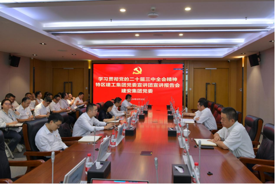 为全面深入学习贯彻党的二十届三中全会精神,8月30日上午,jbo首页(中国)集团党委举行学习贯彻党的二十届三中全会精神宣讲报告会,特区建工集团党委宣讲团成员、jbo首页(中国)集团党委书记、董事长刘进跃作宣讲报告。jbo首页(中国)集团领导、中层正职干部以及全体党员,共220余人在主会场和各视频分会场参加报告会。